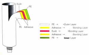 If the contents of the packaging of the daily chemical company are some products that are particularly sensitive to oxygen (such as some whitening cosmetics) or whose fragrance is very volatile (such as essential oils or some oils, acids, salts, and other corrosive chemicals), five layers of co-extruded tubes should be selected at this time. Because the oxygen transmission rate of the five-layer coextruded tube (polyethylene/binder resin/EVOH/binder resin/polyethylene) is 0.2-1.2 units, and the oxygen transmission rate of the ordinary polyethylene two-layer tube is 150-300 units. In a certain period, the weight loss rate of a coextruded tube containing ethanol is several times lower than that of a two-layer tube. In addition, EVOH is an ethylene-vinyl alcohol copolymer with excellent barrier properties and fragrance preservation (a thickness of 15-20 microns is the best effect).